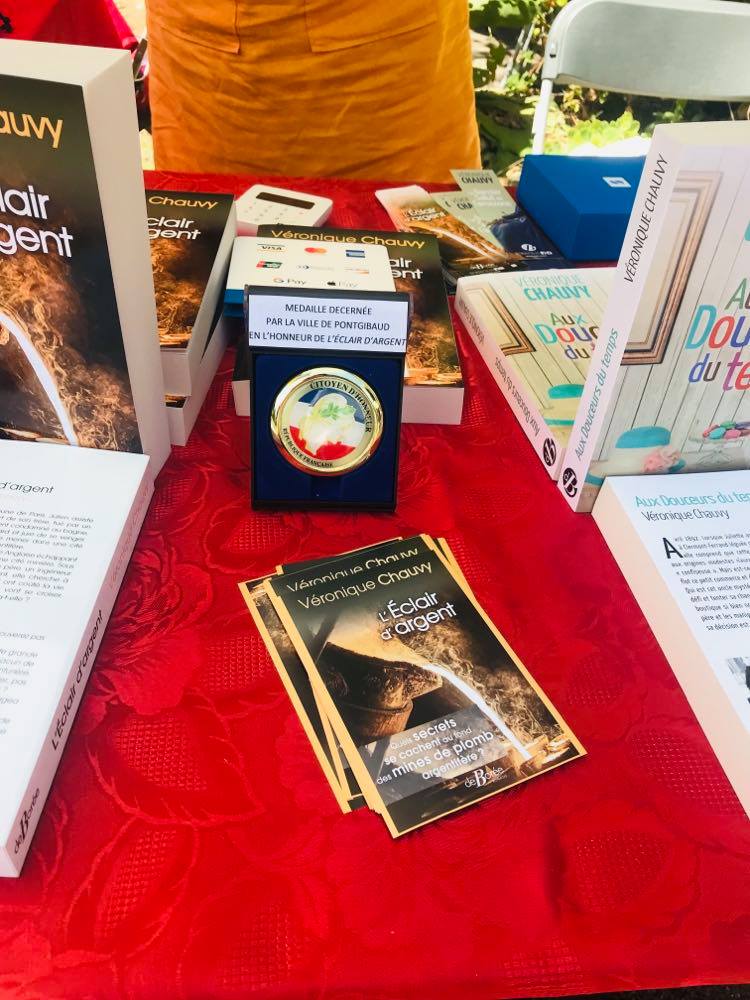 Ma copine Véronique Chauvy était à l’honneur, puisqu’elle a reçu récemment la médaille de citoyenne d’honneur de la ville de Pontgibaud. En effet, son dernier roman, L’éclair d’argent, se déroule là-bas.