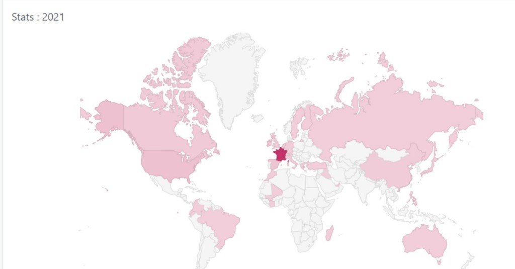 Lâcher mes livres dans le vaste monde, c’est accepter qu’ils soient lus par des gens dont j’ignore tout et dont je ne saurai probablement jamais rien. Avoir un site comme celui-ci, c’est accepter la même chose pour ce qui j’y poste. Sachant en plus que les visiteurs de mon site ne sont pas forcément les mêmes qui lisent mes romans ! C’est assez étrange de se dire que nombre de personnes me connaissent, savent à quoi je ressemble, alors que l’inverse n’est pas vrai. Surtout quand je vois les statistiques 2021.