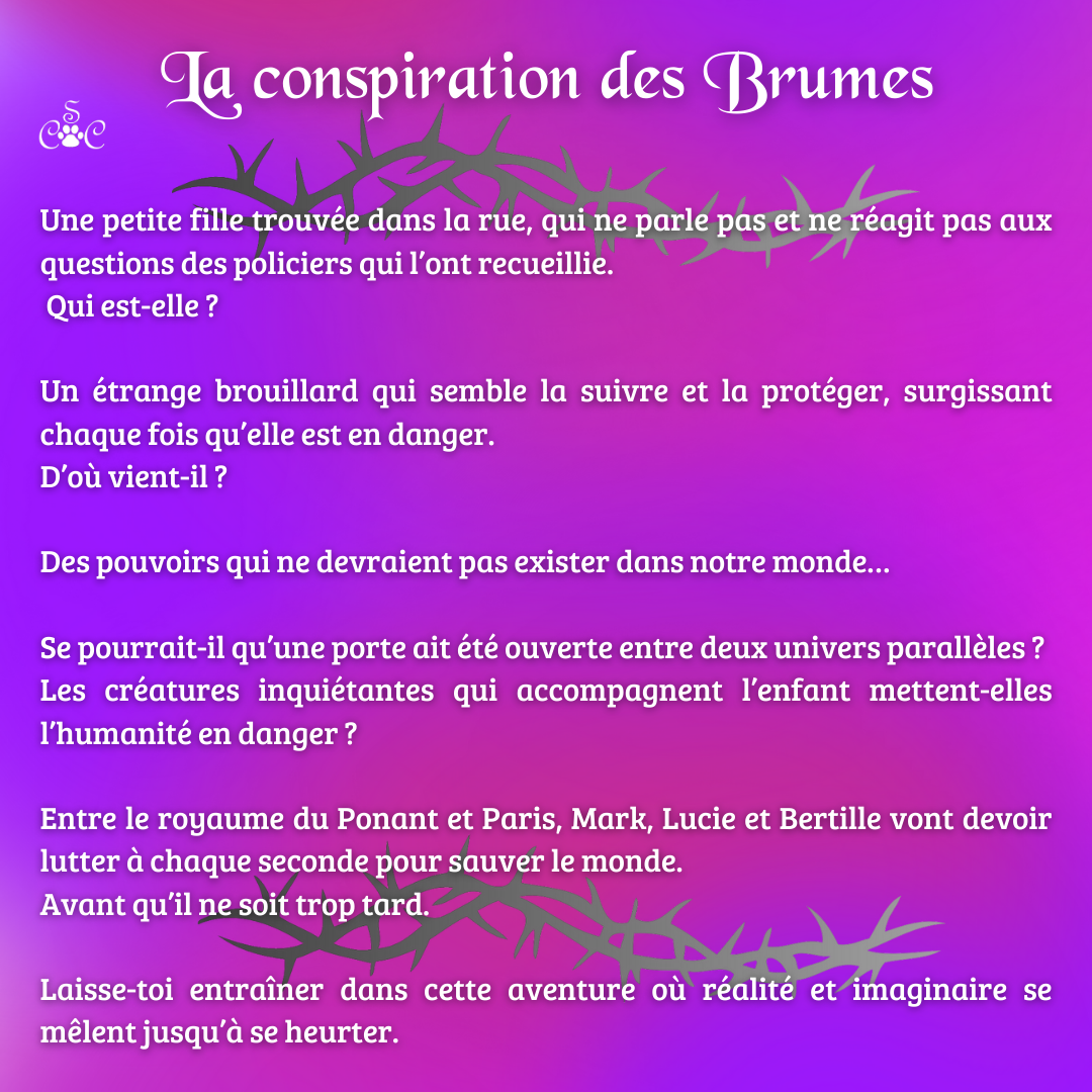 Enfin, le 2 mai, je vous propose une deuxième incursion en littérature jeunesse, avec un roman fantastique à destination des 10-13 ans, La conspiration des Brumes. La couverture est réalisée par Rachel McQuade, l’illustratrice des Enquêtes de Myrtille et Barnabé.