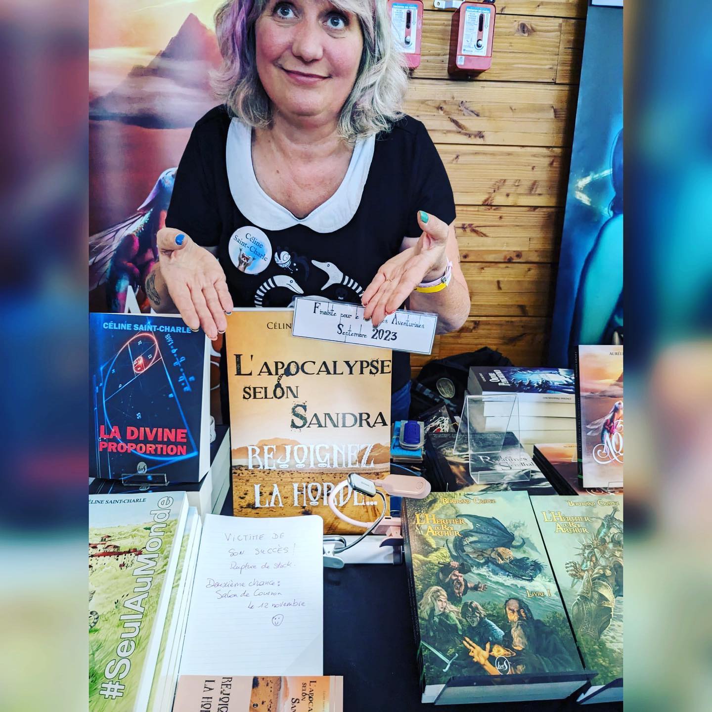 L’édition 2023 des Aventuriales a été épique pour moi, notamment grâce à cette place de finaliste. Le stock de L’Apocalypse selon Sandra n’a pas été suffisant pour contenter tous les lecteurs qui souhaitaient partir en road-trip texan avec la horde. Dès dimanche après-midi, c’était la rupture de stock !