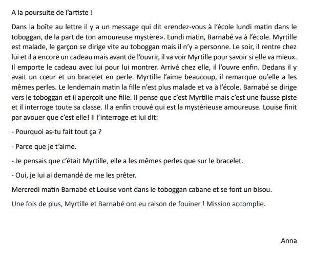 Le lendemain, en arrivant à l’école, ce sont des cœurs réalisés avec des cailloux qui les accueillent dans la cour. Puis un cœur en papier apparaît dans le cartable de Barnabé. Le jour suivant, un grand tissu est attaché au portail, un message a été confectionné en collant des éléments naturels (brindilles, fleurs, feuilles, marrons…).